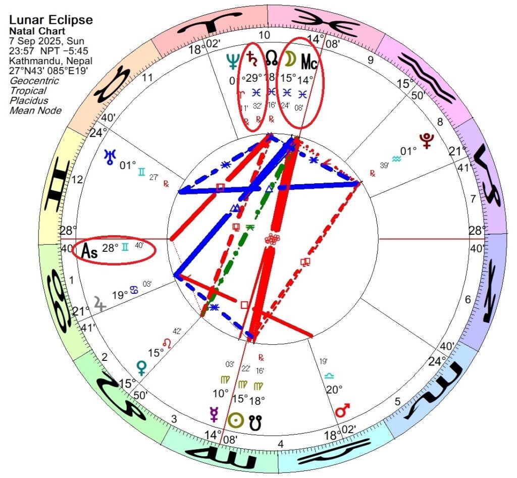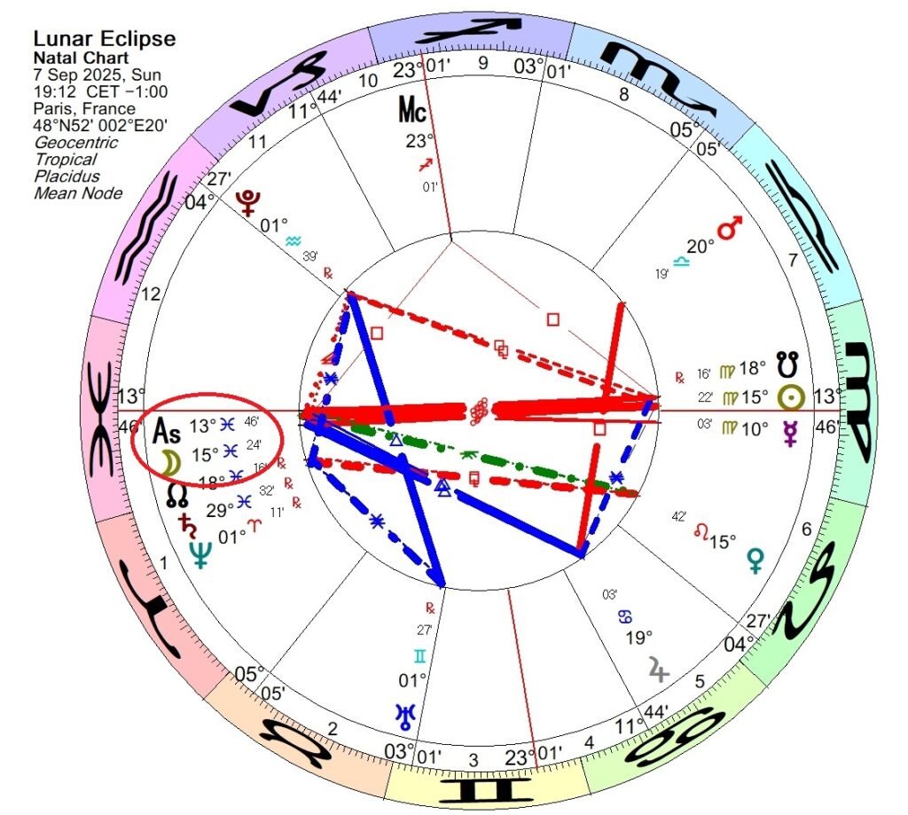 The total Lunar Eclipse of 7 September 2025 was on the Ascendant in Paris and on the Midheaven in Kathmandu (and in Kathmandu, where the finance minister was manhandled and thrown into a river, Saturn in Pisces was also square the Ascendant).
